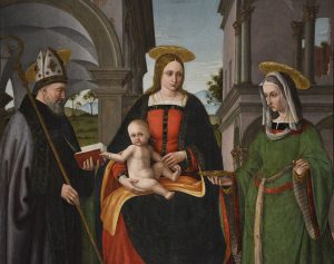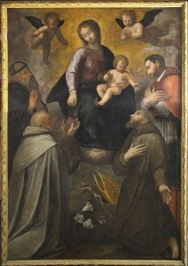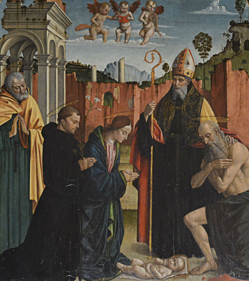 Macrino d’Alba, Madonna in adorazione del Bambino, San Giuseppe, San Nicola da Tolentino, Sant’Agostino vescovo, San Gerolamo ed angeli musicanti.